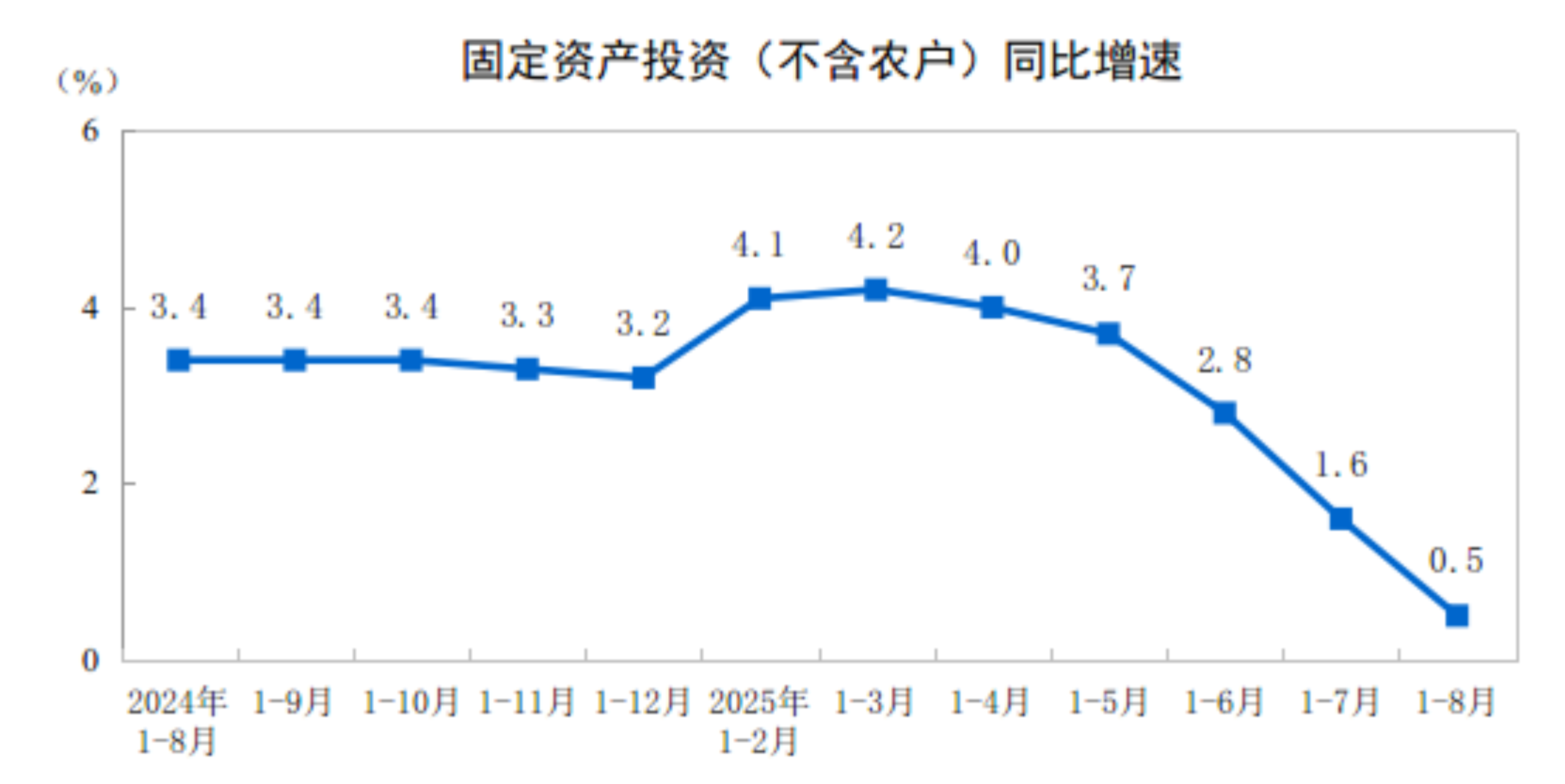 2025年1—8月份,全国固定资产投资(不含农户)326111亿元,同比增长0.5%(按可比口径计算,详见附注7)。其中,民间固定资产投资同比下降2.3%。从环比看,8月份固定资产投资(不含农户)下降0.20%。